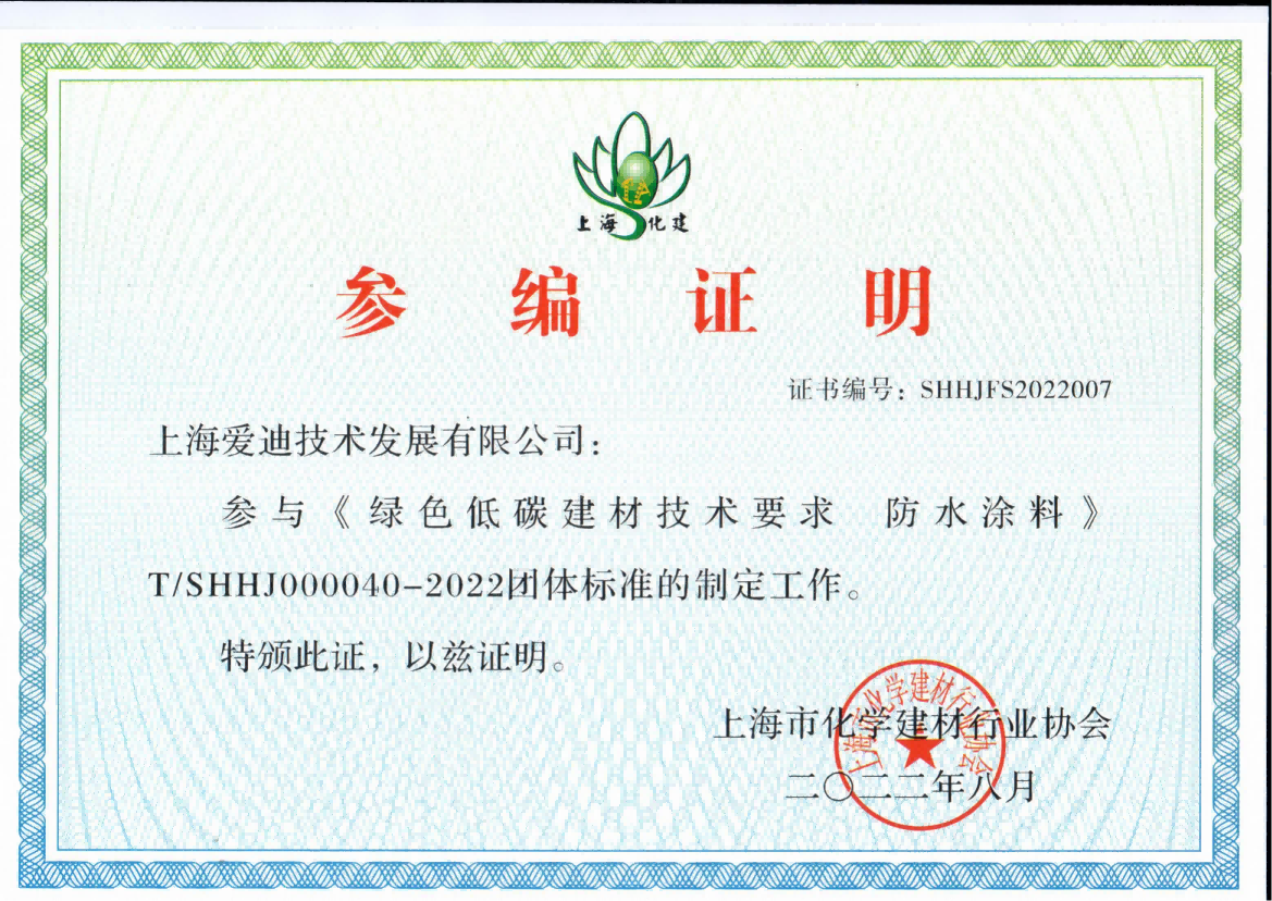 上海化建《綠色低碳建材技術要求 防水涂料》 參編證明