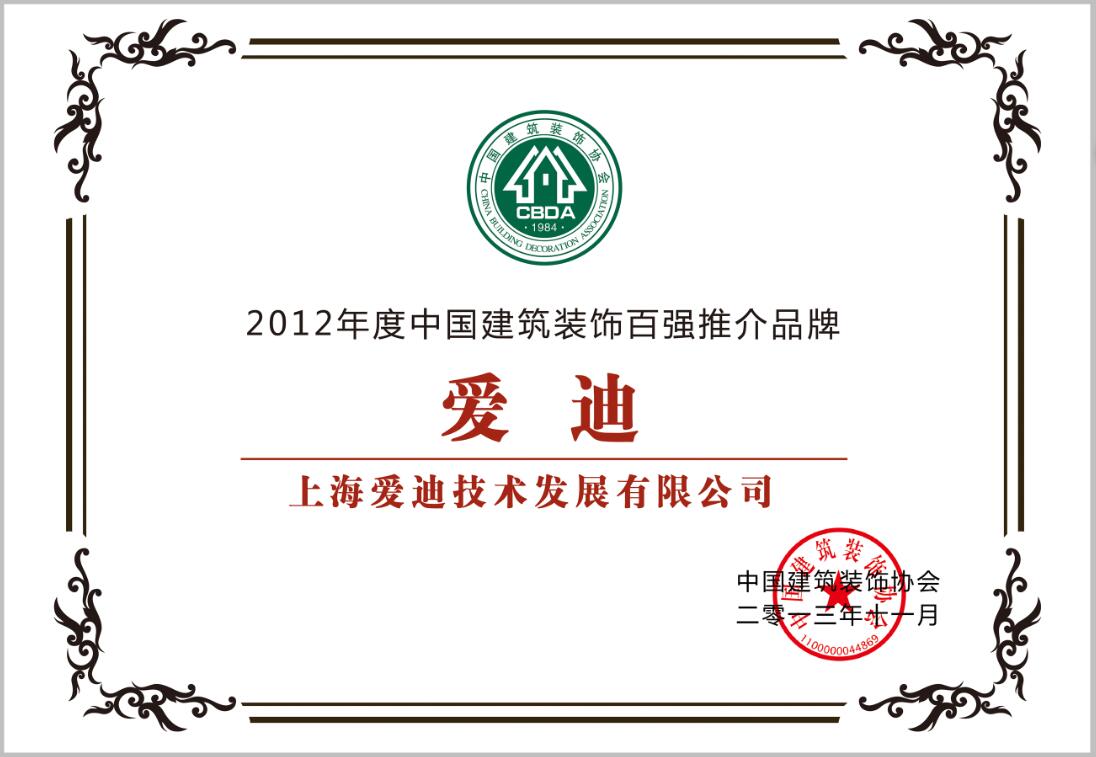 中國建筑裝飾百強聯合推薦品牌—獎狀