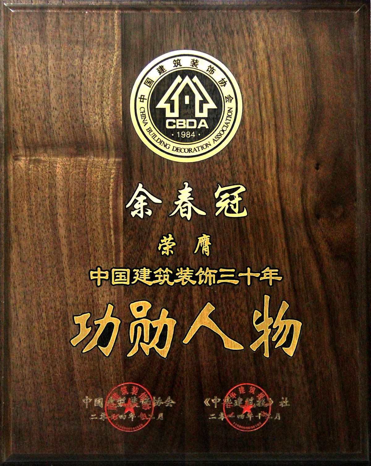 余春冠——中國建筑裝飾三十年功勛人物證書
