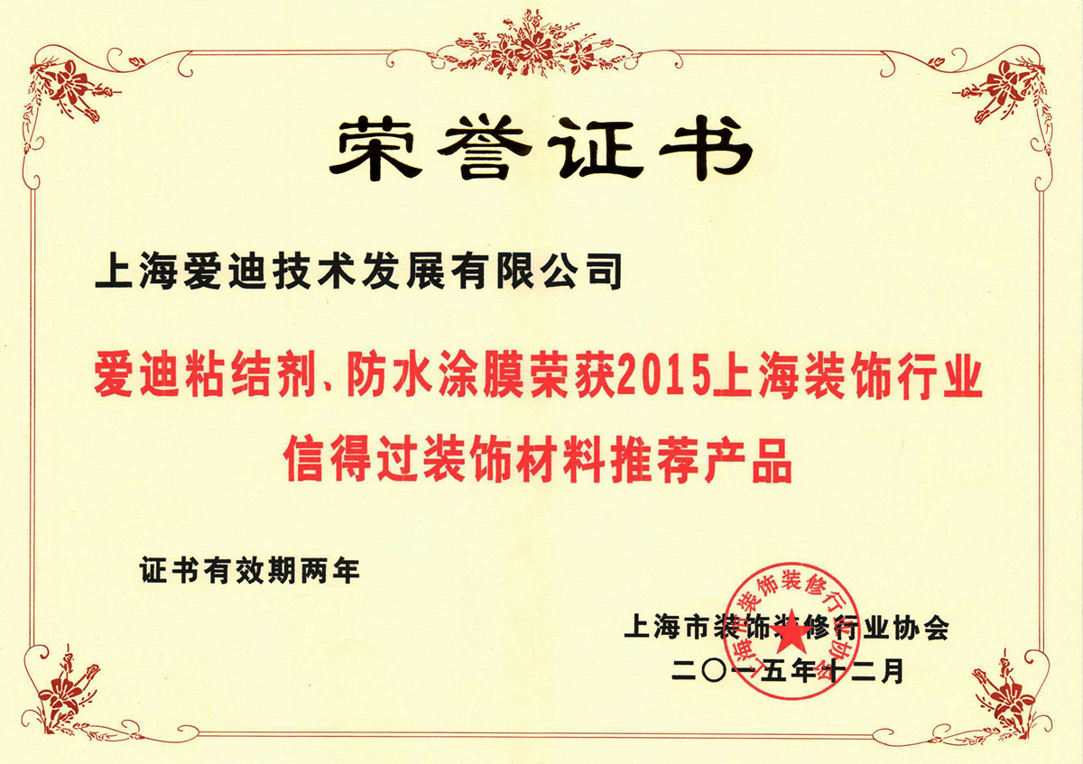 愛迪粘結劑、防水涂膜榮獲2015上海裝飾行業信得過裝飾材料推薦產品
