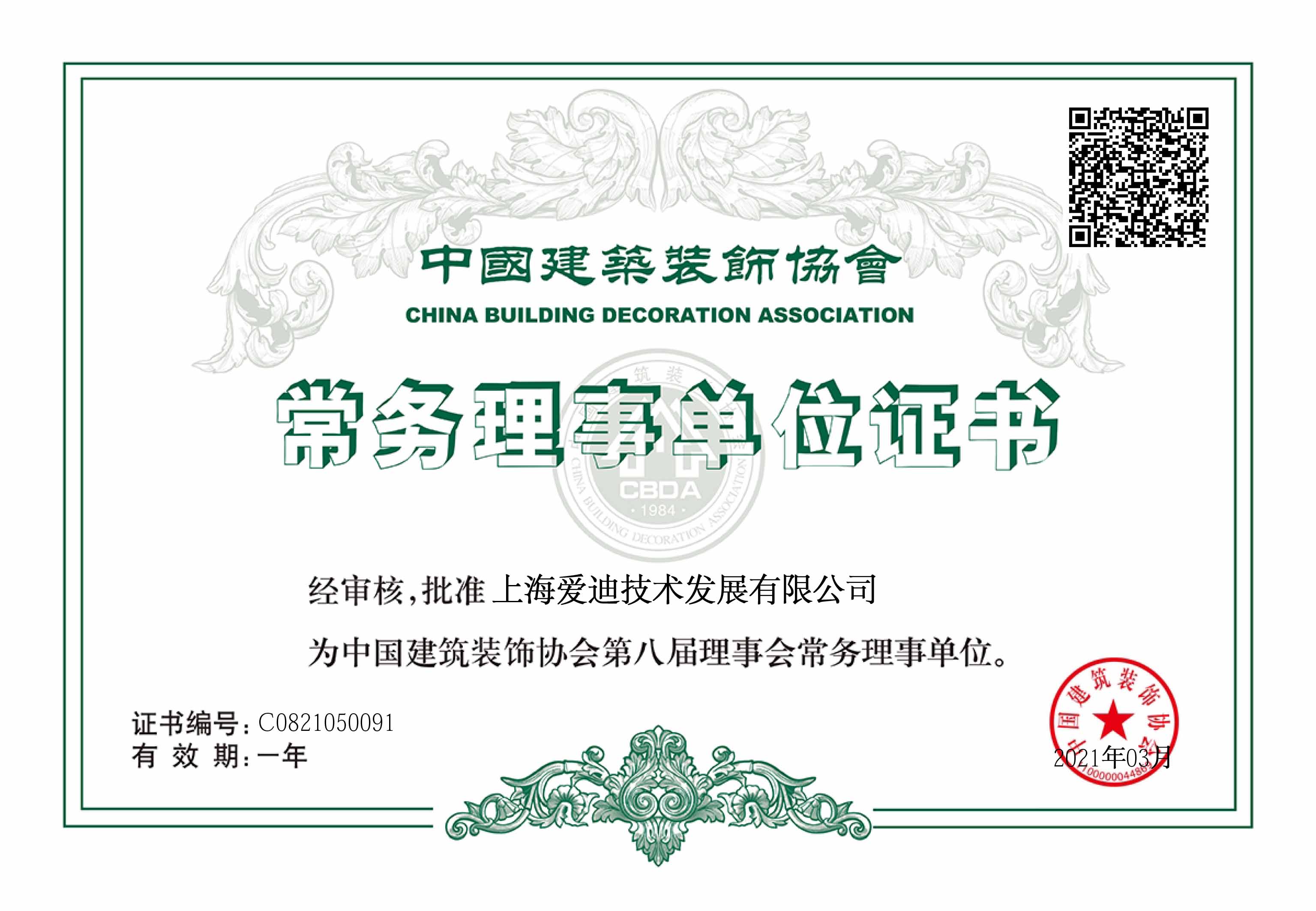 中國(guó)建筑裝飾協(xié)會(huì)常務(wù)理事單位證書